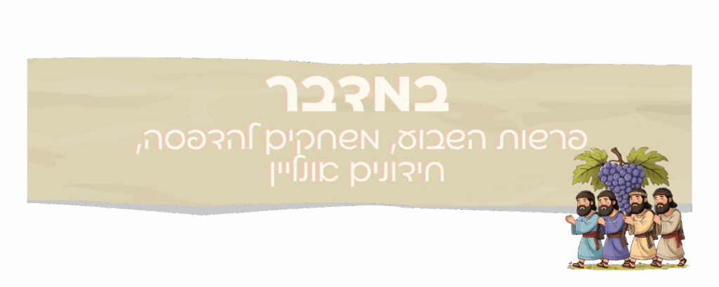 לחצו על המדבקה העגולה כדי לעבור לאוסף תכנים על חומש "במדבר". פרשות השבוע בספר "במדבר"- עיקרי הפרשה, מסר מהפרשה וחידון מסכם לכל פרשה התאמת תמונה למילה פרשת מסעי התאמת תמונה למילה פרשת מטות, משחקי מילים מבולבלות, השלמת מילה, גימטריה ועוד- קובץ מורחב משחקים להדפסה פרשת פנחס- התאמת תמונה למילה, גימטריה, מילים מבולבלות פרשת בלק- מילים נרדפות, גימטריה, התאמת תמונה למילה. אוסף משחקים על פרשת חוקת- סידור האותיות במילה, השלמת אות חסרה והתאמת תמונה למילה. תודה לרבקי אוחנה! אוסף משחקי התאמה להטרמה (תמונות וביטויים) לפרשת "שלח", תודה לרבקי אוחנה. משחקי הטרמה מתוך פרשת קרח מאת רבקי אוחנה משחקי מילים להדפסה על פרשת השבוע "בהעלותך", הטרמה מעולה, תודה לרבקי אוחנה. משחקי פרשת השבוע לפרשת נשוא להדפסה משחקי פרשת השבוע לפרשת "במדבר" להדפסה