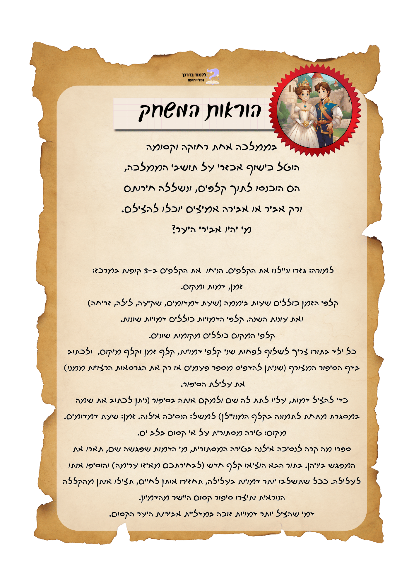 בנוסף, הערכה מכילה שישה דפי כתיבה מעוצבים והוראות משחק+ 2 מדליות שצריך להדפיס, לניילן ולהכין (מדליית אביר היער ומדליית אבירת היער)