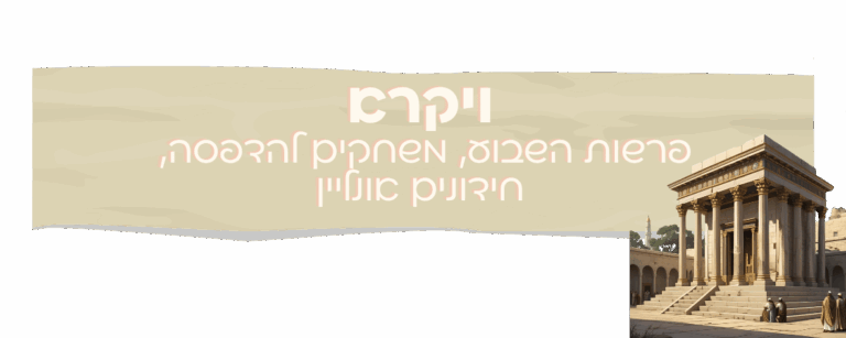 לחצו על המדבקה העגולה כדי לעבור לאוסף תכנים על חומש ויקרא. ספר ויקרא- סיכום, מסר מהפרשה, חידון לכל פרשה. פרשת ויקרא לילדים פרשת צו- מצגת לילדים פרשת שמיני פרשת תזריע פרשת מצורע פרשת "אחרי מות" פרשת קדושים פרשת אמור להדפסה- משחקי זיכרון ואוצר מילים משחקי מילים להדפסה מאת רבקי אוחנה על פרשת ויקרא- מילים וביטויים, התאמת מילה לתמונה משחקי התאמת תמונה למילה והשלמת ביטויים לפרשת צו, מאת רבקי אוחנה משחקי מילים להדפסה מאת רבקי אוחנה על פרשת שמיני- השלמת ביטויים והתאמת מילה לתמונה משחק התאמת תמונה למילה והשלמת ביטויים על פרשת "תזריע מצורע" מאת רבקי אוחנה. משחקי מילים וביטויים על פרשת "אמור" מאת רבקי אוחנה משחקי התאמת מילה לתמונה והשלמת ביטויים ל"אחרי מות- קדושים" מאת רבקי אוחנה משחקי מילים להדפסה, הטרמה על פרשות בהר-בחוקותיי. התאמת מילה לתמונה והשלמת ביטויים
